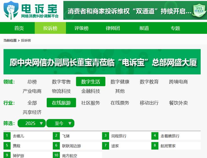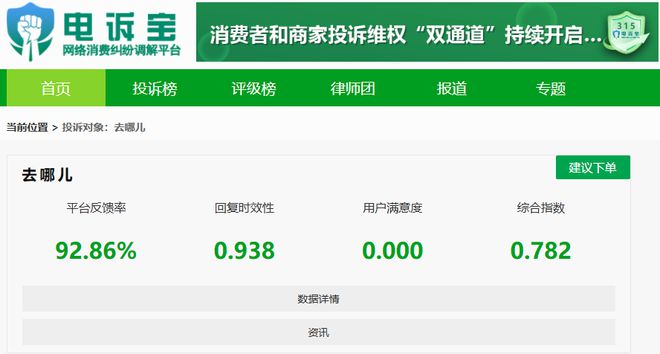 2025年至今,“电诉宝”受理投诉中涉及的在线旅游领域用户有效投诉显示(依据投诉量排行),“去哪儿”排名第1位。最新评级为“建议下单”。除此之外,其他被投诉的类似平台还有:去哪儿、飞猪、同程旅行、走着瞧旅行、携程、联联周边游、途家、航班管家、骑驴游、南方航空。