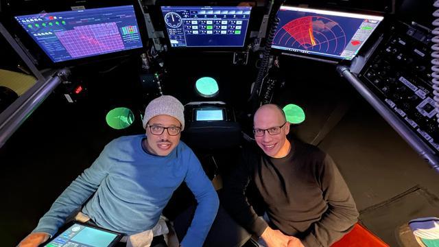 海军研究办公室研究船项目官员罗布·斯帕罗克(左);海军历史与遗产司令部高级考古学家布拉德利·克鲁格,在载人潜水器阿尔文号内。右上角屏幕显示着从F-1号潜艇船体反射回来的声呐信号。图片来源:伍兹霍尔海洋研究所布鲁斯·斯特里克罗特