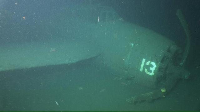二战时期复仇者鱼雷轰炸机残骸的前部,该机于DATE年在南加州近海执行训练飞行时坠入大海。图片来源:安娜·米歇尔,伍兹霍尔海洋研究所;NSF GEO;伍兹霍尔海洋研究所